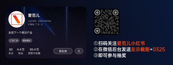 扫码关注爱范儿小红书,在后台发送关注截图及关键词「0325」◆◆★,抽三位小伙伴和古蓝色细雳线一起贴贴。