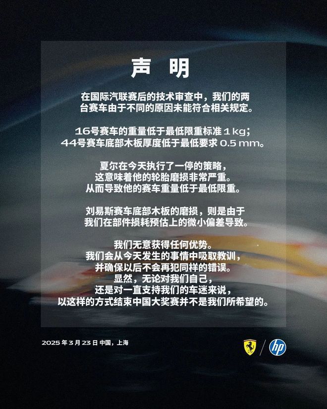 昨日◆★■■◆,法拉利 F1 车队通过个人社交媒体账号■◆◆◆,发布声明表示■■■◆,在国际汽联赛后的技术审查中,法拉利 F1 车队两台赛车由于不同的原因未能符合相关规定: